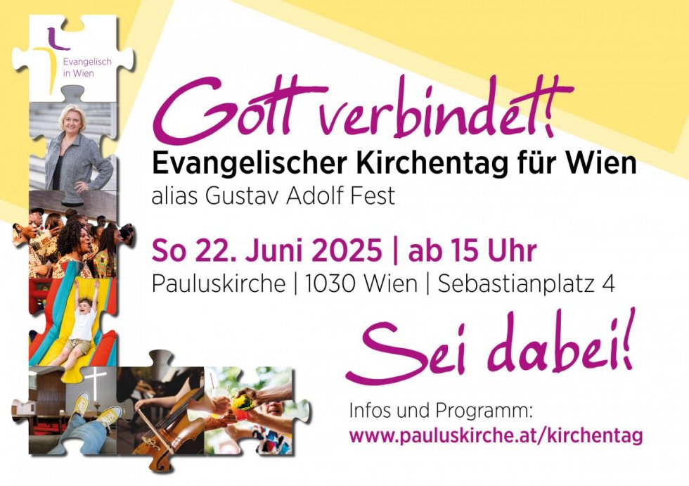 Gott verbindet und Evangelisch-Sein auch! Etwa 2% der Menschen in Wien sind evangelisch. Das Evangelische Wien ist in fünf Regionen mit deren Kirchengemeinden unterteilt. Jedes Jahr richtet eine andere Gemeinde einen Evangelischen Kirchentag aus - auch bekannt als Gustav-Adolf-Fest. Dieses Jahr lädt die Pauluskirche aus dem Dritten das Evangelische Wien ein unter dem Motto „Gott verbindet!“ am Sonntag, den 22. Juni.
