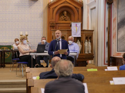 Maskenpflicht, Abstandsregeln, Einlass nur mit negativem Testergebnis, lüften, desinfizieren – eine besondere und bewusst kurz gehaltene Superintendentialversammlung erlebten die haupt- und ehrenamtlich Delegierten des sogenannten „Parlaments“ der Evangelischen Kirche A.B. in Wien am Samstagvormittag, 19. Juni 2021. Sie trafen sich in der größten evangelischen Kirche Österreichs: der Gustav-Adolf-Kirche in Wien-Gumpendorf.