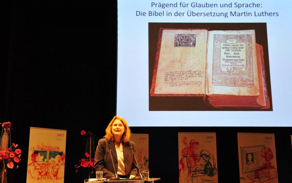 Wien (epdÖ) – „Was erwartet die Leserinnen und Leser der neuen Luther-Bibel? Mehr Luther erwartet die Leserinnen und Leser auf alle Fälle“, sagte Jutta Henner, Direktorin der Österreichischen Bibelgesellschaft, beim diesjährigen Reformationsempfang am 3. November im Wiener Odeon-Theater. Henner präsentierte vor zahlreichen Gästen aus Kirchen und Gesellschaft die neue Luther-Übersetzung, die anlässlich des Reformationsjubiläums vor wenigen Wochen erschienen ist. „Es ist recht und billig, dass das Reformationsjubiläum mit einer neuen Luther-Übersetzung beginnt“, betonte Henner zu Beginn ihrer Präsentation.