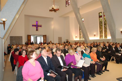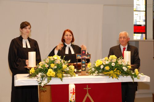 Rund 300 Besucher kamen zum Festgottesdienst in die Johanneskirche, die jetzt neu nach Osten ausgerichtet ist. Die dunkel-drückenden Holzteile, wie die Empore und Kirchenbänke, wurden im Sommer entfernt. Jetzt zieren helle, hölzerne Sessel den frisch renovierten, gut beleuchteten, wärme-isolierten, hohen Kirchenraum. Die sichtbaren Betonstreben – markante Merkmale der Johanneskirche – wurden den Originalplänen entsprechend, restauriert. Die hohen, schlanken Buntglasfenster kommen jetzt noch besser zur Geltung und tauchten auch während des Festgottesdienstes den Raum in besonderes Licht.
