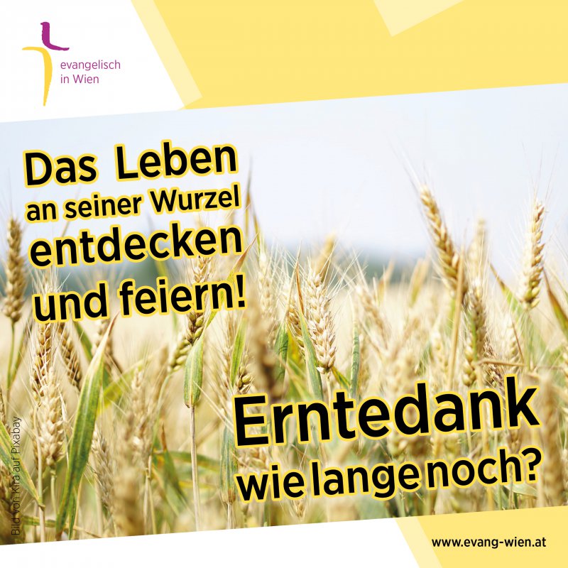 Weizenfeld mit Schrift: Erntedank – das Leben an seiner Wurzel entdecken und feiern! Und: Erntedank - wie lange noch?