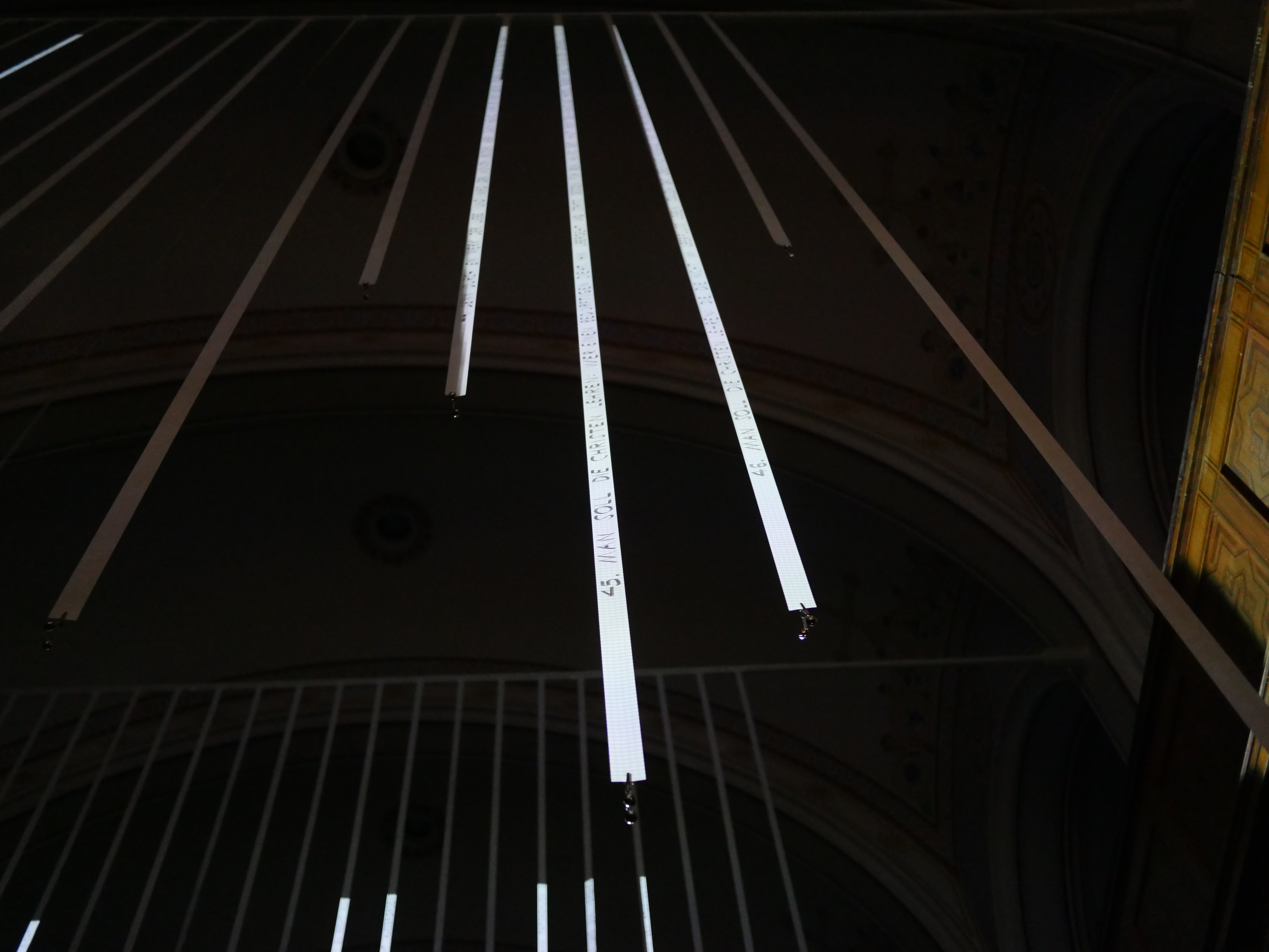 Betritt man die Kirche bei Dunkelheit, werden die Bänder durch eine Videoprojektion bespielt und die Schrift wird deutlich sichtbar. Durch ein Wechselspiel der Projektion erscheinen einzelne Sätze und verschwinden wieder. Lichtstreifen fahren die Bänder entlang. Licht macht das sichtbar, was eigentlich schon da ist.