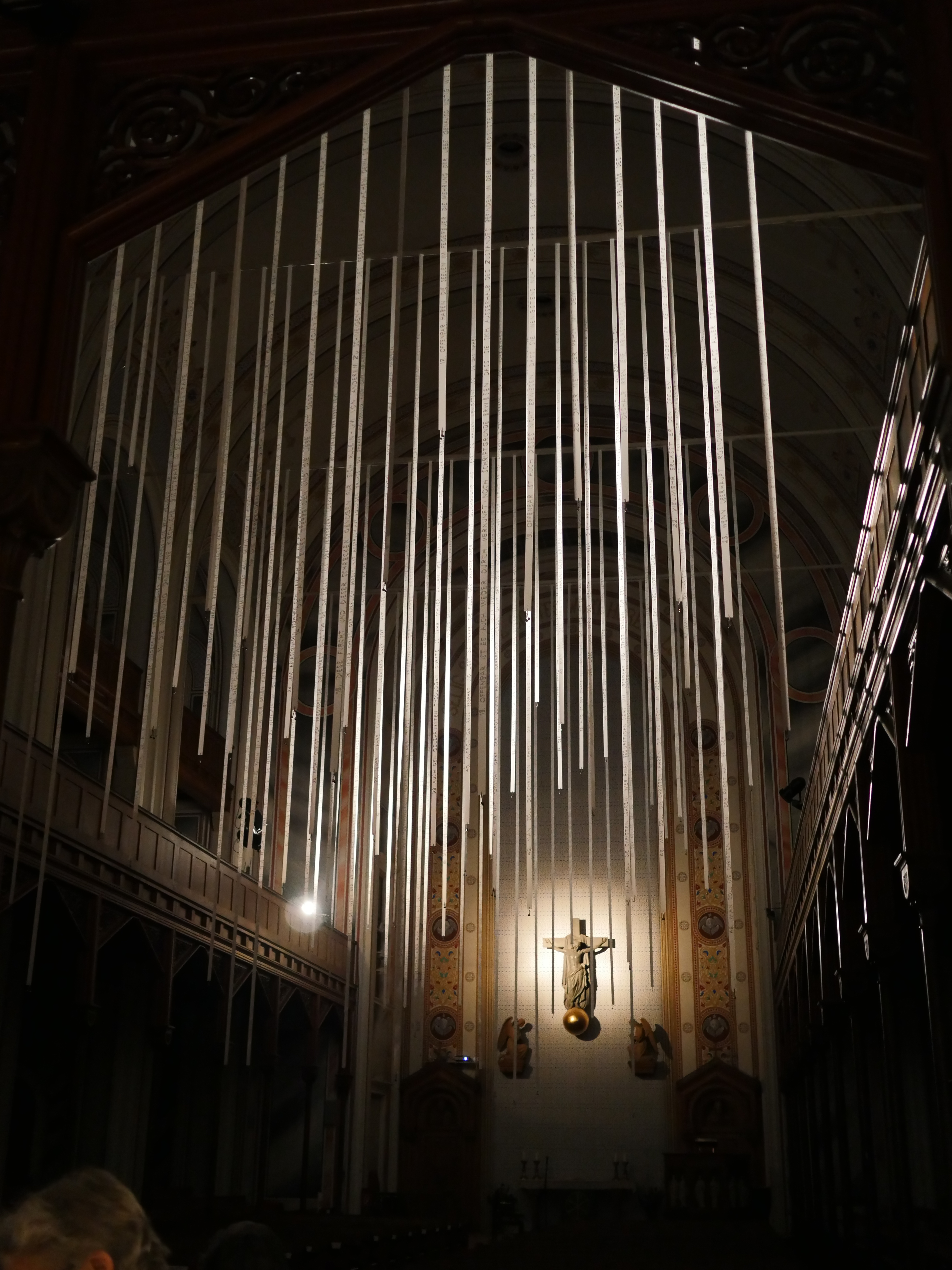 Betritt man die Kirche bei Tageslicht, sieht man weiße Bänder, die bis zum Altarraum hin ein Muster im Raum entstehen lassen, das die Wahrnehmung von Höhe und Tiefe des Raumes noch verstärkt. Die Betrachter*innen müssen sich anstrengen um Worte und Sätze zu lesen und ihren Inhalt verstehen zu können, sie müssen sich mit den Sätzen auseinandersetzen und sich Zeit nehmen.