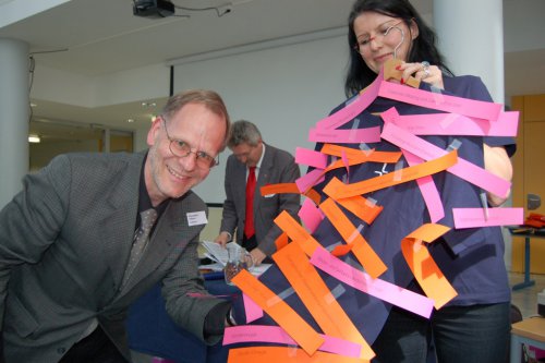 Etwas weiter in der Zukunft liegt das Reformationsjubiläum im Jahr 2017, das seit einigen Monaten seine Schatten vorauswirft und auch in der Versammlung am 10. Mai Thema war. Eingestimmt durch das Grußwort von Oberkirchenrätin Gerhild Herrgesell und ausgestattet mit verschiedenen Klebepunkten, bestimmten Delegierte und Gäste der Versammlung welche Dimensionen, welche detaillierteren Schlagworte der Dimensionen und welche Plakate zu den Dimensionen ihnen gefielen – beziehungsweise nicht gefielen. Die vier Dimensionen hatten die evangelischen Kirchen in Österreich in der im Herbst 2013 ausgeteilten „Reformationsbox“ vorgegeben: „Glaube und persönliche Überzeugung“, „Gemeinschaft und Gleichberechtigung“, „Offenheit und Respekt“, „Freiheit und Verantwortung“. Sie dienen als Diskussionsgrundlage und auch zur Profilschärfung des „Evangelisch-Seins“ im Prozess, den die Gesamtkirche „Auf dem Weg nach 2017“ nennt. Die Ergebnisse der Punkte-Vergabe werden nun der Gesamtkirche rückgemeldet.