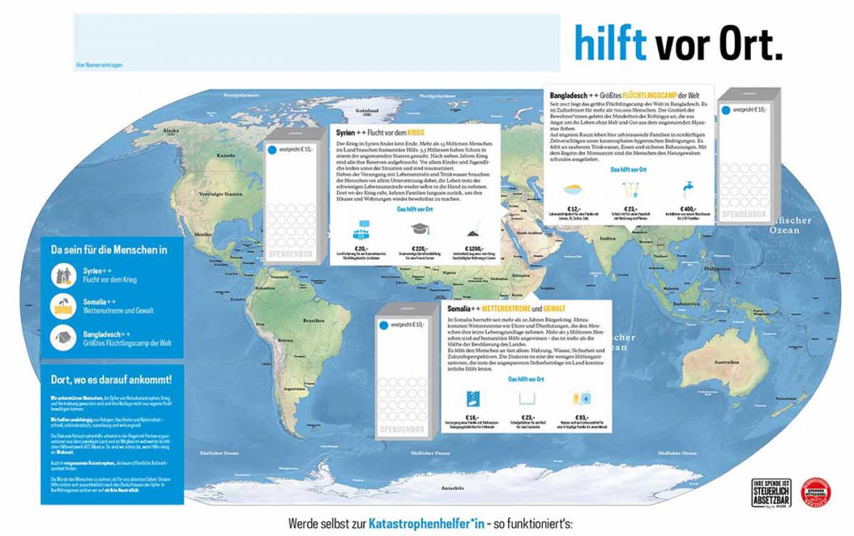 Schwerpunktländer der Kampagne sind Syrien, Somalia und Bangladesch. In Syrien brauchen nach Angaben der Diakonie Katastrophenhilfe mehr als 13 Millionen Menschen humanitäre Hilfe, 5,5 Millionen SyrerInnen sind zudem vor dem Bürgerkrieg in angrenzende Staaten geflohen. Im Bürgerkriegsland Somalia gefährden Dürre und Überflutungen die Existenz der Bevölkerung. In Bangladesch befindet sich seit 2017 das größte Flüchtlingscamp der Welt. 700.000 Menschen sind hierher geflohen, der Großteil von ihnen Angehörige der verfolgten Minderheit der Rohingya im benachbarten Myanmar.