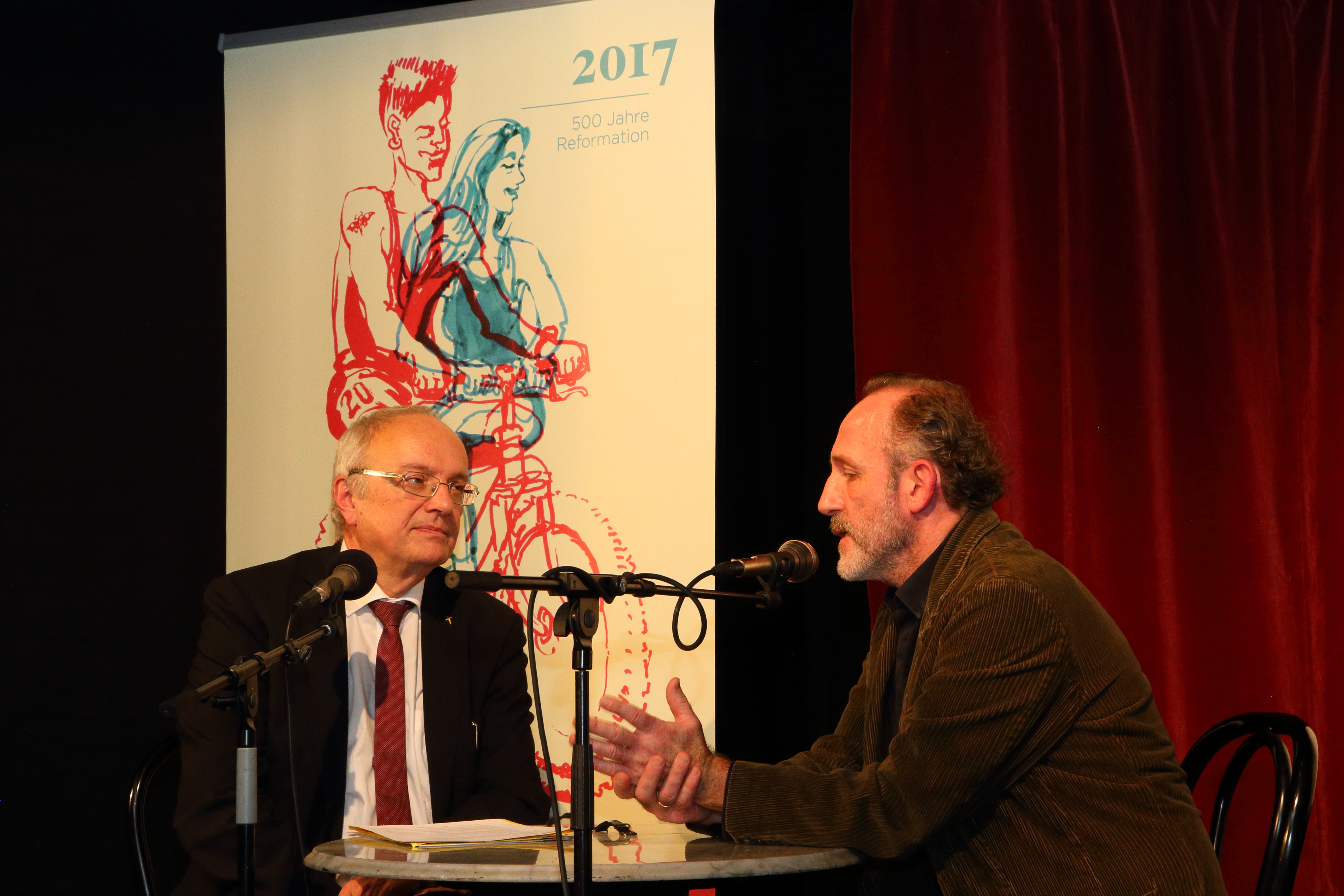 Beim anschließenden Programmpunkt „Frei samma!... oder?“, der vom Ghana Minstrel Choir eröffnet wurde, platzte der Theatersaal aus allen Nähten. Schauspieler Klaus Rott amüsierte mit zwei kurzen Lesungen von „Ä“ (u.a. ein Songtext der Punkband „Die Ärzte“) bis „Z“ (u.a. ein Kurztext von Lothar Zenetti). Nach der ersten Lesung unterhielt sich Bischof Michael Bünker mit Schauspieler und Regisseur Karl Markovics, im Besonderen über dessen Filme „Atmen“ und „Superwelt“. Das Schöpferische beim Filmemachen, die Umsetzung einer Gottesbegegnung im Film (in Markovics „Superwelt“ tritt Gott auf, aber weder als Erscheinung noch als Stimme) und Wunder im Kleinen und im Großen (Markovics: „Die Welt ist für mich per se ein Wunder“) kamen beispielsweise zur Sprache. Das zweite Bühnengespräch führten Superintendent Hansjörg Lein und Volker Jung, Kirchenpräsident von Hessen/Nassau (Deutschland) u.a. über den Widerstandskämpfer und Pfarrer Martin Niemöller, über Antisemitismus, Ökumene und Flüchtlingspolitik.