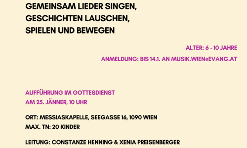 Addresse: MessiaskapelleSeegasse 161090 WienSamstag, 24 Januar 2026 - 9:30vormittags bis 4:00nachmittagsKINDER-SING-TAG
